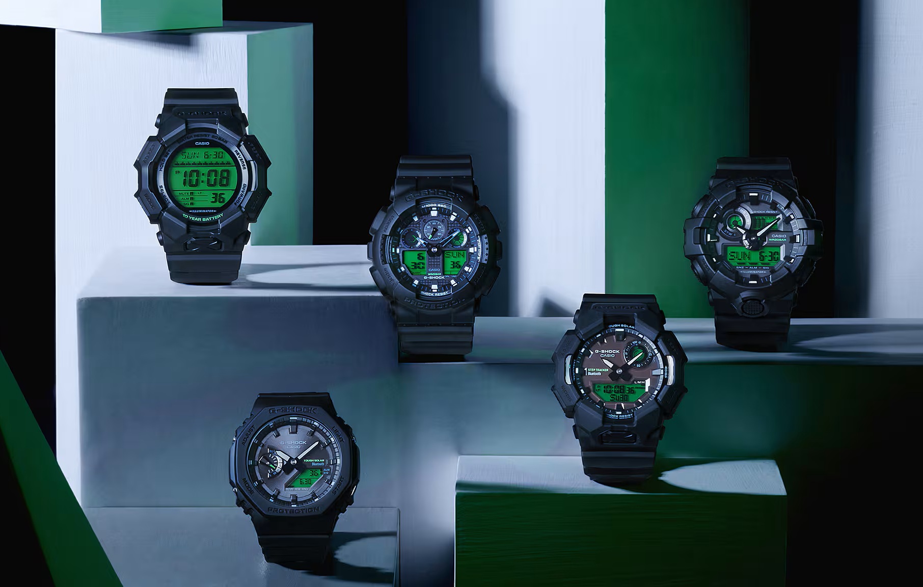 Представлены пять моделей часов G-Shock в черно-зеленом цвете