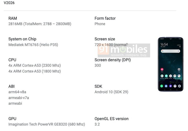 На днях в базе данных Google Play Console этот аппарат был замечен под техническим кодом V2026, благодаря чему стали известны ключевые параметры гаджета. Если смартфон Vivo Y12 был построен на однокристальной системе MediaTek Helio P22 (MT6762), то в основу аппаратной схемы Vivo Y12s положен более производительный чипсет MediaTek Helio P35 (MT6765), имеющий в составе восемь ядер Cortex-A53, видеоконтроллер PowerVR GE8320 и встроенный модем 4G/LTE.